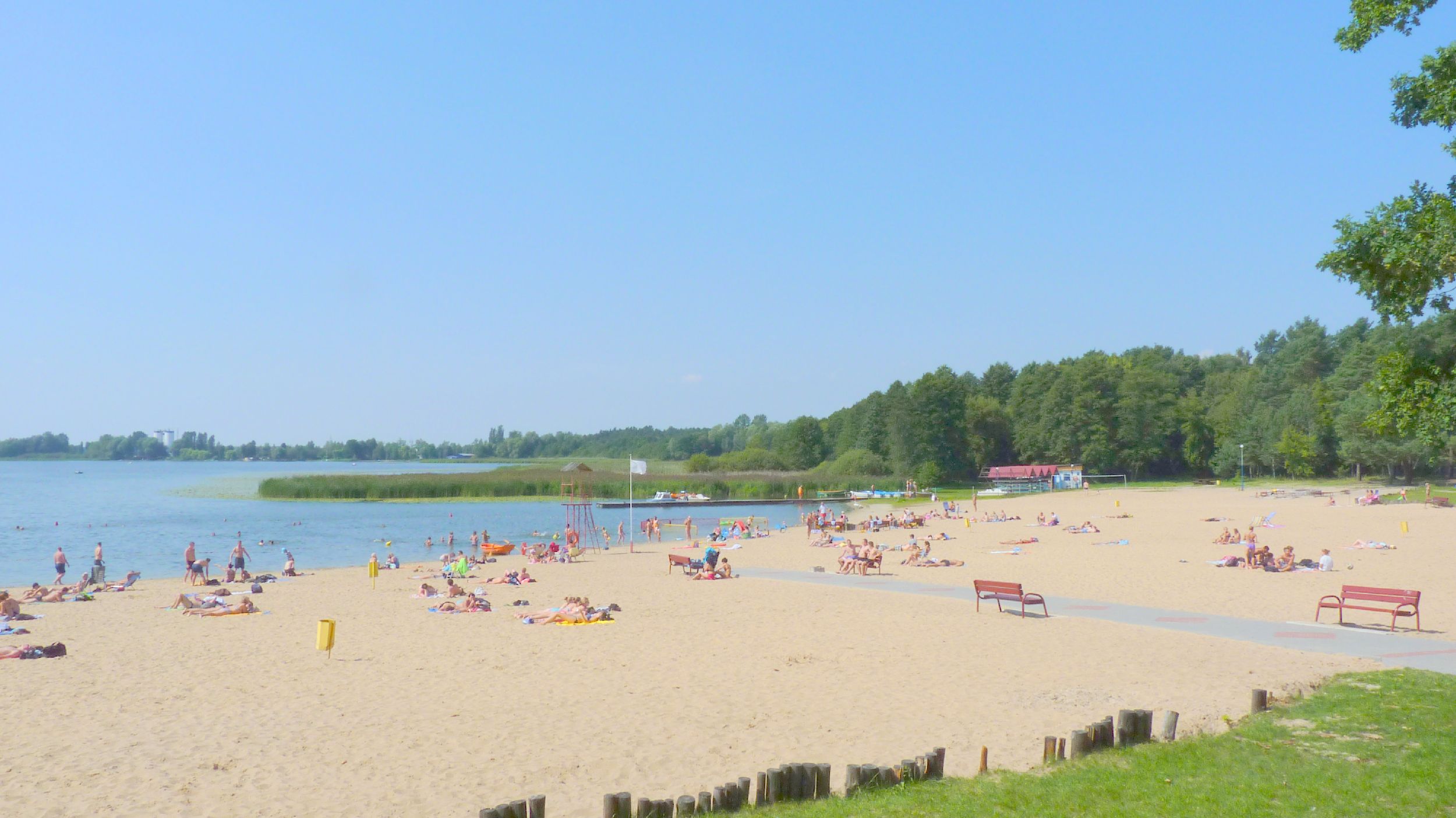Najbardziej czuć to w słoneczne letnie weekendy, gdy piasek nagrzewa się od słońca, a jezioro tętni życiem: ktoś pływa kajakiem, ktoś inny wiosłuje na SUP-ie, dzieci budują zamki z piasku, a na pomostach co chwilę słychać plusk skoków do wody. Mimo tej wakacyjnej atmosfery na plaży zachowany jest porządek – teren jest zagospodarowany, zadbany, z klarownie wydzielonymi strefami dla kąpiących się, bawiących się i odpoczywających.